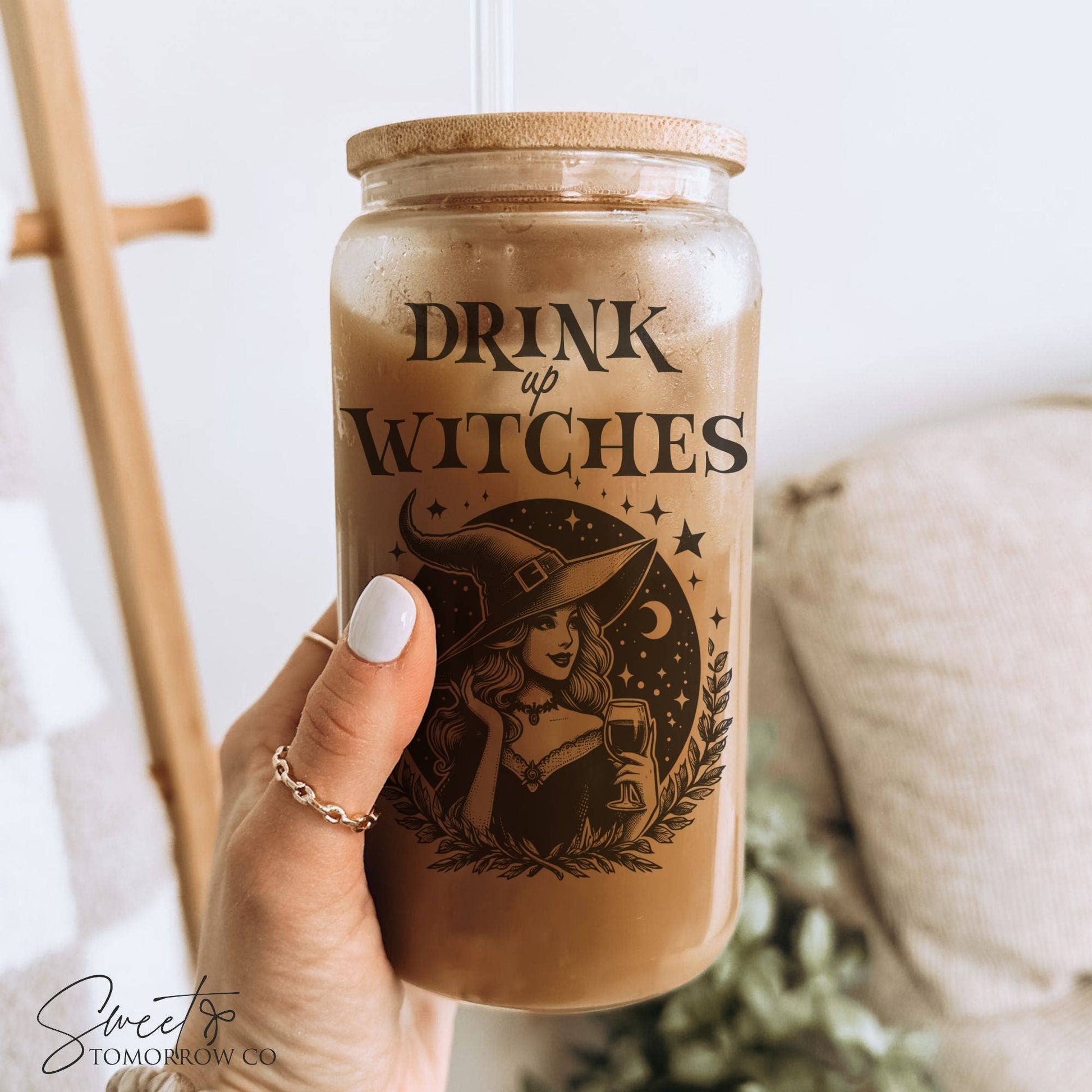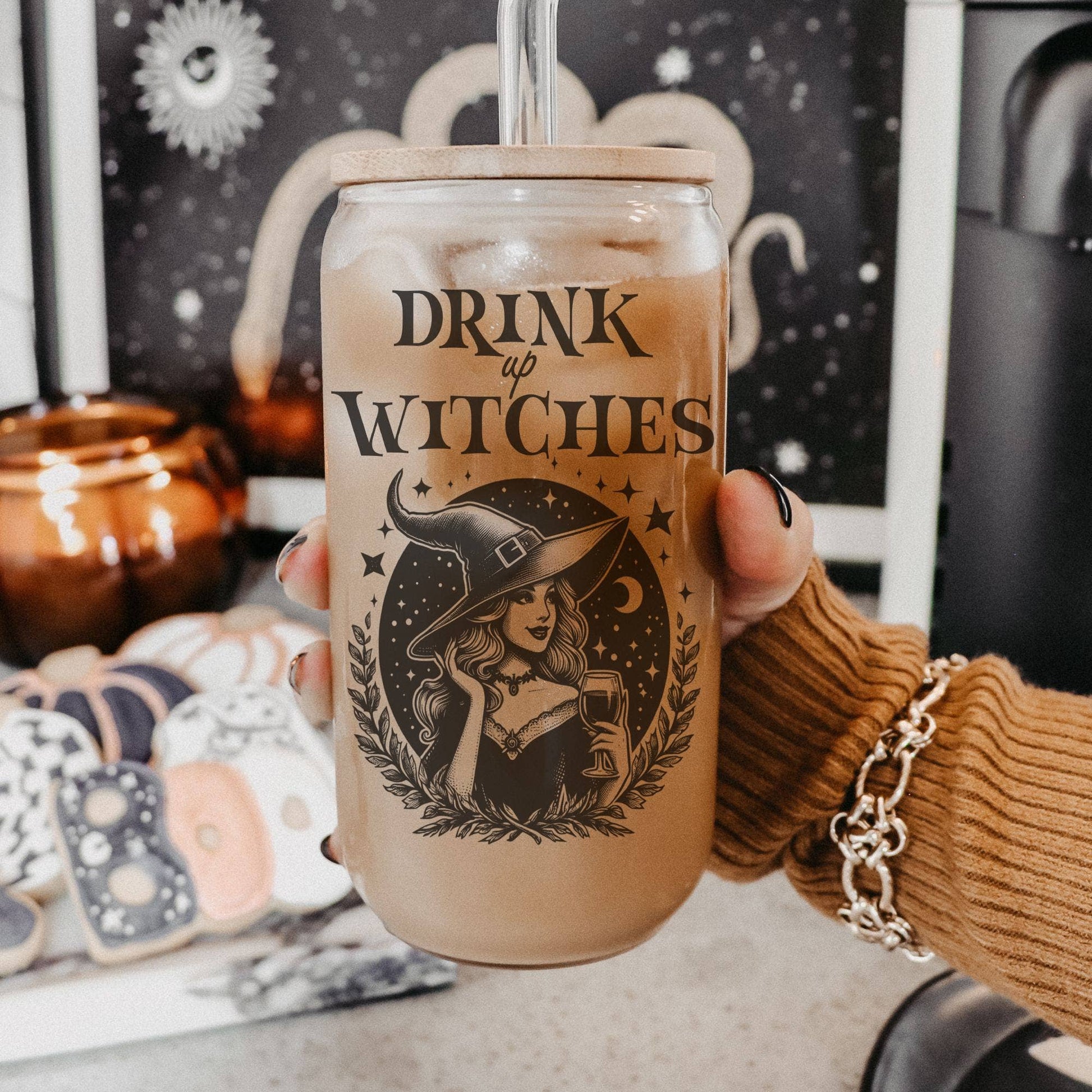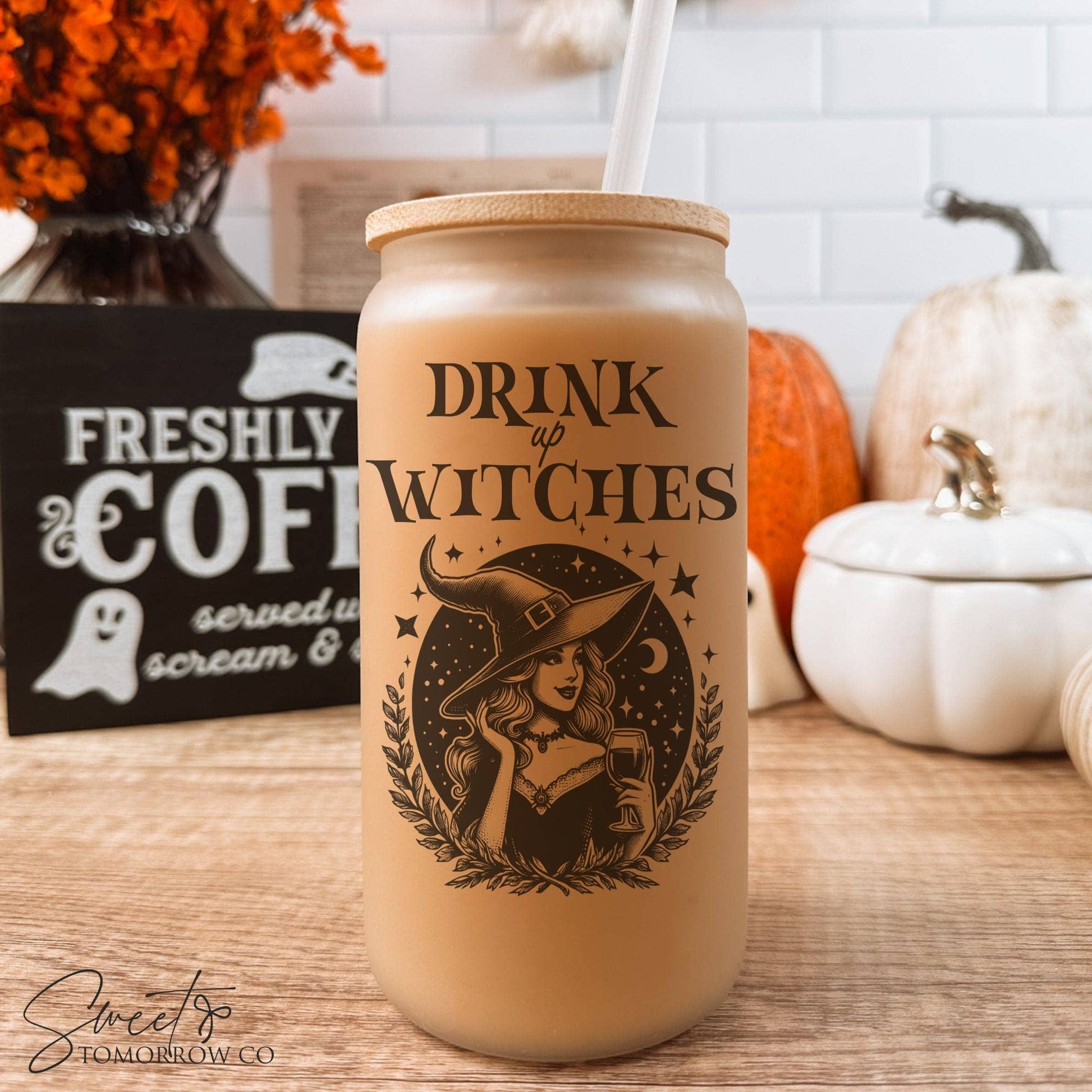 Drink Up Witches Glass (16oz) 𝗰𝗵𝗼𝗼𝘀𝗲 𝗙𝗥𝗢𝗦𝗧𝗘𝗗 𝗴𝗹𝗮𝘀𝘀 𝗰𝘂𝗽 ***Glass is a see-through material and will yield muted & semi-transparent colors due to its nature. * bamboo lid * plastic straw * permanent sublimation design (not vinyl)