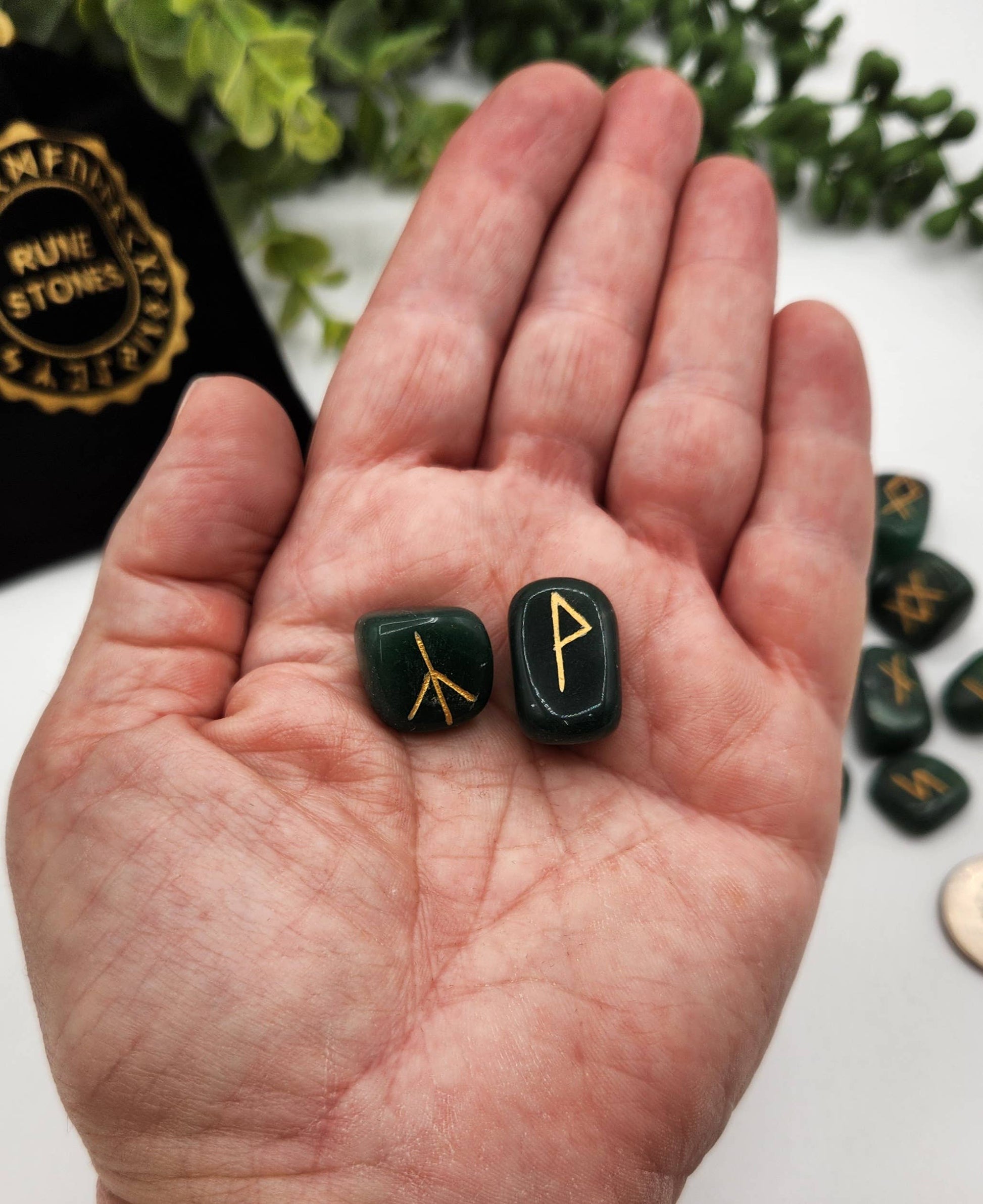 Beautiful Jade Semi-Precious Gemstone Rune Sets have 24 stones with engraved symbols and 1 stone without any engraved  symbols.  Each Rune set comes with a velvet pouch to keep them safe when not in use.